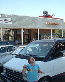 The other day we headed to Gorham to gather coordinates on Baxter Library and Goodwill. Yeah, Goodwill. The kids love it there – they can buy a lot of stuff for only a couple of dollars (which is all they ever have anyway). While gathering coordinates my 7-year-old spotted Darth Vader on the roof of Burger King. This brought on speculation about the SpongeBob theft and the hopes that Vader didn’t suffer the same fate. So she decided she wanted a picture with Vader for posterity “in case he got stolen.”
