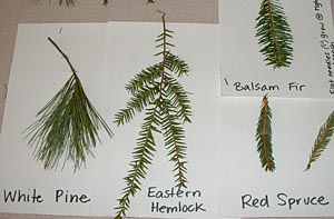 Our first tree “lesson” at home (which we’re doing on our own until our Tree Club notebooks arrive) focused on trees with needles, also called coniferous or evergreen trees. There are four major trees in Maine with needles and are fairly easy (even for me) to tell apart – White Pine, Red Spruce, Eastern Hemlock and Balsam Fir.