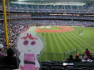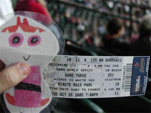 It continues to be all about Flat Stanley at our house this fall. We just received an email with some photos of Flat Blossom (our Flat Stanley’s “sister”) from her host family in Texas. Turns out she went to Tuesday night’s World Series game in Houston. The host family was disappointed their home team didn’t end up winning the game (or the series), but it sounded as if it was quite a game. Flat Blossom stayed until the very end, all 5 hours and 41 record-breaking minutes of it apparently.