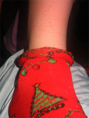 If you look closely, you can see that G. had an imprint of a Christmas tree on her leg from her tight ski boot. “Mom, I am SO not wearing these socks skiing again!”