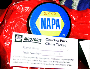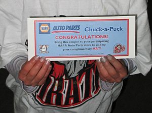 Between the second and third periods of the game we went to the lower stands’ balcony (yes, we buy the cheap seats) to throw our pucks. And as sheer luck would have it, L. actually managed to throw her puck onto the Chuck-A-Puck mat and won a hat (what was even stranger was that out of all the pucks, I took the above picture of the one she actually won with). She collected her gift certificate and has plans to go to the store with her dad this weekend to collect her prize.