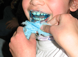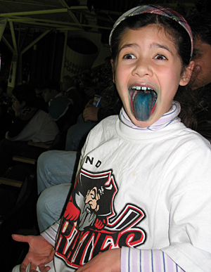Another highlight of the game for the kids was the cotton candy. Not a usual concession item purchased by me or my husband, Grandpa decided to treat them to the confection. And true to form, the kids had a little fun with the blue stuff.