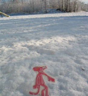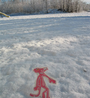 Pink Panther is a visiting Flat Stanley that G. posed for the photo. There was enough snow that G. could stand it up on its own.