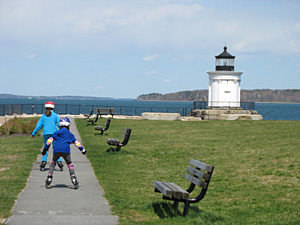 The next day G. insisted we go rollerblading again so we headed to Bug Light in South Portland. That trail was great; it was flat and rock- and twig-less. Although we did dodge some lettuce, tomatoes and olives, much to the amusement of L.