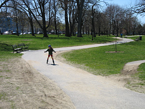 I liked the park’s trails because when I had trouble stopping, I just ditched myself in the grass; it was much softer. And yes I admit to throwing myself on the ground to stop when I can’t gain control of my speed, regardless of the sport. It’s what I did when I learned to snowboard and since pavement is a lot harder than snow, the grass was a more appealing option. The only complaint we had about Deering Oaks were all the rocks, twigs and sand on the trail. But it was manageable. And the barely-there “hill” in the park was just enough to pick up speed but not feel out-of-control. The kids liked that a lot.