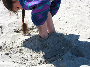 After 15 minutes of running through the water and getting nearly every part of themselves wet, L. came running over to me (yes, I chose the dry sand to enjoy instead). She then started burying her feet with some urgency. I asked her what she was doing.