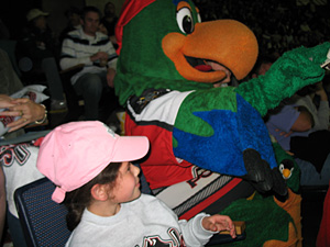 The usual activities and songs went on between periods of the game, including the YMCA song. L. had some fun with her Pirates’ penguin doll that we caught on video.