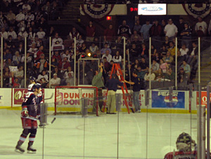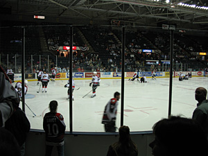 During the third period of the game the play came to a stop for a while because one of the plexi-glass plates cracked (I think that’s what happened) at the other end of the rink and they had to replace it. So out came a guy with a ladder and then a minute later two other guys went running across the ice with a new plate. They had the whole thing replaced in a couple of minutes.