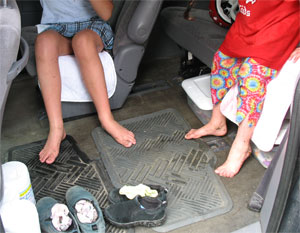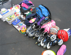 - 3 pairs rollerblades, 3 pairs elbow and knee pads, 2 helmets, 3 pairs of wrist guards, 4 disc golf discs, 2 pairs ballet shoes, 2 pairs of lyric dance shoes, 3 pairs of tap shoes (I tap too), 1 pair flip flops, 1 pair of sneakers, 2 sand buckets, 6 plastic rings, 3 jump ropes, 1 hacky sack, 1 rubber ball, 2 plastic horses, 5 containers of hand wipes, 3 umbrellas, 2 fleece sweaters, 4 pairs of winter gloves, 1 Pokeno game, innumerable hair elastics (a hazard of girls), 5 issues of National Geographic Kids magazine, 2 “treasure” rocks, 4 AA batteries with recharger, a sketch book, a box of pencils and markers, plastic container with a change of clothes for each of the kids (socks, underwear, pants, shirt, sweater), jumper cables, jug of oil, jug of windshield fluid, jug of coolant, a snack box filled with crackers and gum, 2 unopened bottles of water, several small geocache toys, CD case with audio book, a mystery paperback and my backpack full of other stuff. And this didn’t count the wrappers, half-empty water bottles and other trash we removed.