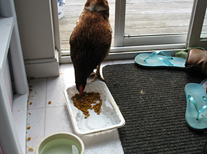 I’ve told the kids a million times not to let the chickens on the porch and not to feed the chickens the cats’ food even though they like to eat it.