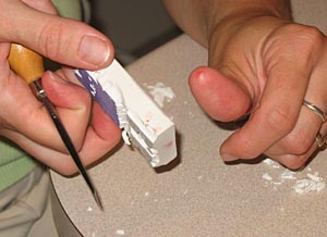 I traced a picture of Bunny – of course! – onto the eraser and then started cutting away the shape. But I had a little trouble.