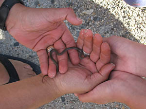 Last summer they had found a similar snake with one distinct difference – it was paralized. Yeah, he couldn’t move anything other than his tongue. I didn’t think the snake would live more than a few days and agreed to let the girls put it in an old aquarium in the house.