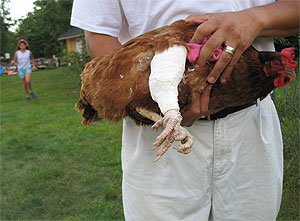 And we have an update on Lucy the Lucky Chicken that the girls wanted to share. Fino put a plaster cast on her leg yesterday and now she can hobble around the coop.