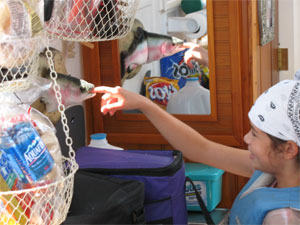 What kid doesn’t love the singing fish plaque? Every time L. passed by this one hanging in the galley, she had to hit the button to play a song and stick her finger in its mouth.