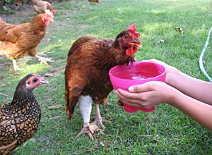 But her lack of movement has made her kind of smelly (well more than usual). So the girls attempted to give her a little misting shower with the hose in hopes of cleaning her back feathers a bit.