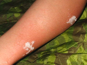 One of G.’s legs with multiple stings covered by the paste we made. Looked totally weird but G. agreed that it didn’t hurt as much with the paste on.