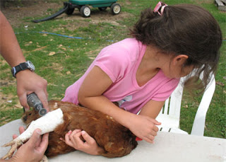 G. took the photos below while L. held Lucy down. Fino did all the precision work and Lucy was back in the coop a short while later without a scratch.