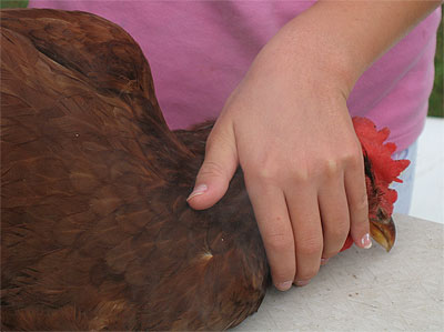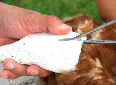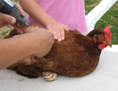 G. took the photos below while L. held Lucy down. Fino did all the precision work and Lucy was back in the coop a short while later without a scratch.