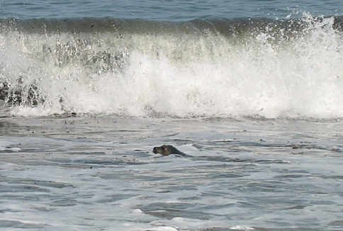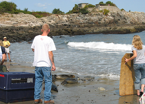 Volunteers use large wood “shields” to re-direct any errant seals. Some were staying close to shore initially and needed some coaxing to swim out to sea.