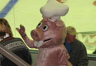 The various mascots were out in force last night with Salty Pete, Crackers, Mercy Bear and Oakie. But L. and her little friend (who we ran into at the game and ended up sitting with) didn’t recognize “Buck” the pink pig. None of the people around us seemed to know who he was either.