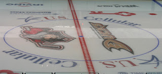 The kids spent the first few minutes chatting about the ice looking different this year — the center line has diamonds instead of a filled line and the Ducks have a new logo.