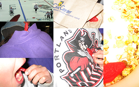 But in usual form, the girls were being silly while watching the game. This time with a couple of stray Swedish fish in my backpack. Since meeting someone recently who had never had the penny candy (which is far from costing a penny these days), the girls have been talking about how much they love Swedish fish. And that prompted them to “introduce” their fish friends to a hockey game like they did with Bunny and Flat Stanley last season.