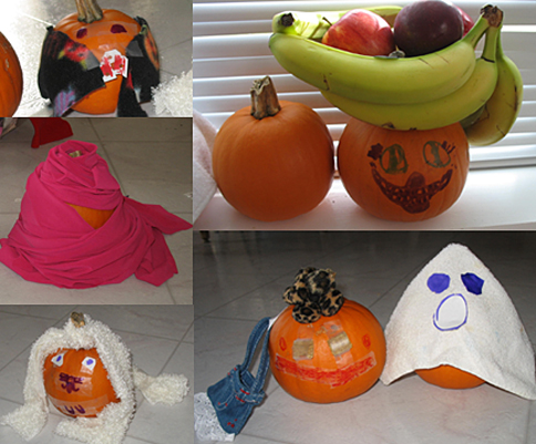 Meet the pumpkins starting clockwise from bottom left: Poodle, Mummy, Vampire, “Save” (reserved for her sister to decorate), Chiquita Banana Girl, Ghost, The Lady (love the Life cereal eyes).