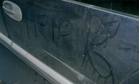 I went outside a little while later to check on the crew trying to rescue Toddy and found Grandpa trying to stick a wire through the window, G. in tears and L. writing in the layer of dust on the van.