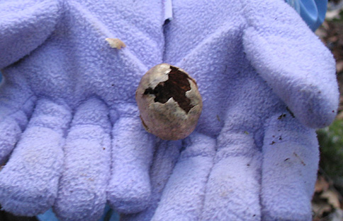 The group returned to the indoor classroom after our hike with a bunch of acorns the instructor had asked them to collect as well as a slug, worm and ant found by some of the other girls. The workshop leader asked the group to put their acorns in a glass of water and to discard the ones that sank to the bottom. The ones that floated were then cracked open to see if there was a weevil (insect) inside. Only 1 in the 18 acorns collected actually contained a weevil but the girls thoroughly enjoyed cracking open the nuts.