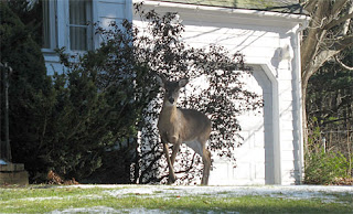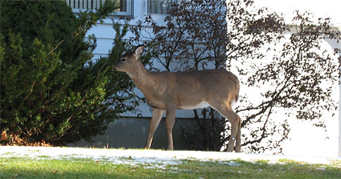 The kids and I were driving through Falmouth yesterday and spotted a deer grazing on someone’s front yard shrubbery.