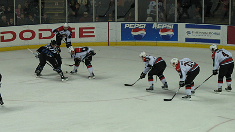 The Pirates and Falcons on the ice. It was a good thing the youth league players weren’t standing next to Mitch Fritz from the Springfield team. He made even the 6-foot plus Pirates’ players look short (he’s 6’8″).