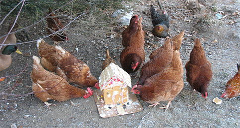 When you’ve moved the family’s edible gingerbread house around the kitchen a thousand times and everyone’s picked off and eaten their favorite candies, it’s time to give it to the chickens.