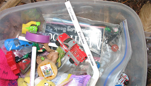 A couple of our hybrids (geocaches that have letterbox stamps) don’t really have room for the traditional geocache trading items and travel bugs/coins but some people have left in those in our caches recently.