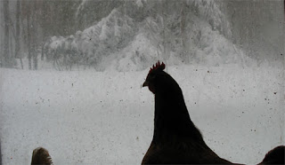 Nope, they aren’t. The Almeida poultry is quite comfortable out in the coop and don’t seem to mind snow storms – like today’s – at all.
