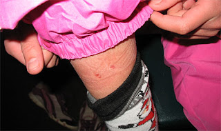 We joked that she was bitten by a vampire on the mountain. And note the Christmas socks, just like last year 🙂