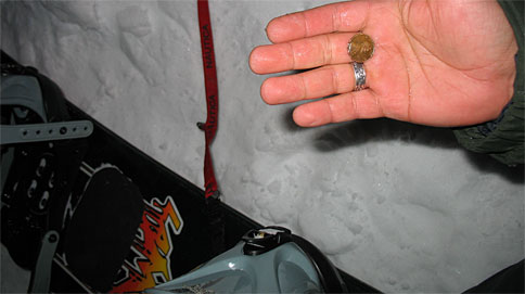 He nearly got frostbite trying to fix my binding because the wind chill was so strong and cold and he couldn’t manage the penny and bindings with his gloves on. But it turned out that the penny was more worse for the wear than he was.
