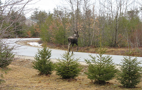 This morning as we walked out our front door, we found a moose in our yard. I grabbed the camera after gawking for a minute but by then it was on the move again and crossing the street.