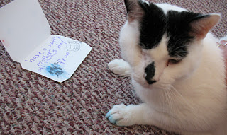 The girls always make sure Toddy is included in the card-giving tradition. But he will likely spend the next week trying to get blue marker off his paw.