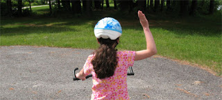 We found a quiet, grassy spot for a snack on our way back to Brunswick and after eating, L. demonstrated her bike hand signals for a poster she’s making about bikes for her 4-H project.