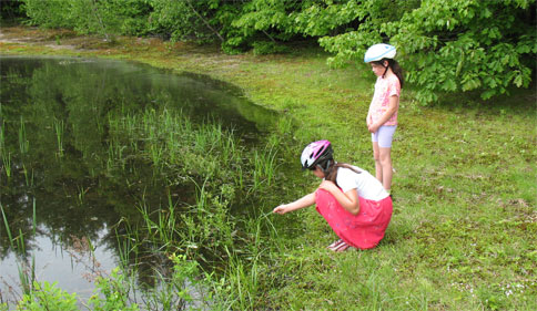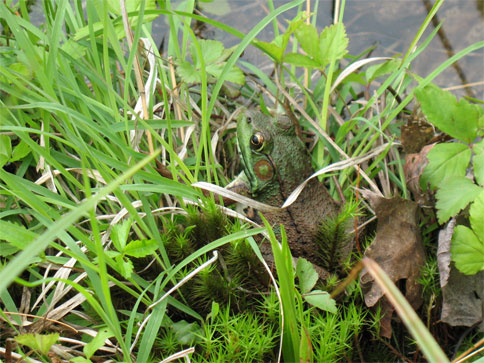 At the Topsham trail head there was a small pond brimming with frogs. I was surprised we heard the croaking over the highway traffic noise and airplanes flying overhead (it’s not a quiet nature trail). But we did and were rewarded with many frog sightings and their croaking songs.