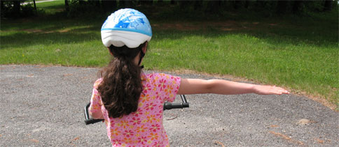We found a quiet, grassy spot for a snack on our way back to Brunswick and after eating, L. demonstrated her bike hand signals for a poster she’s making about bikes for her 4-H project.