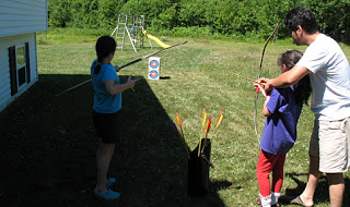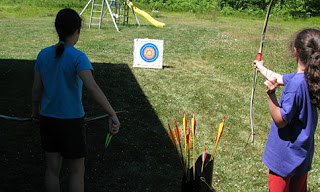 L. and Fino have been enjoying shooting arrows with a couple of used bows they picked up recently. So when one of her friends came over yesterday, L. wanted her friend to try it too.
