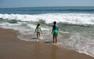 The kids immediately ran toward the water. The waves were bigger and stronger than I expected so I called them back and gave them the lay of the land (i.e., mom’s rules) — don’t go in further than your knees.