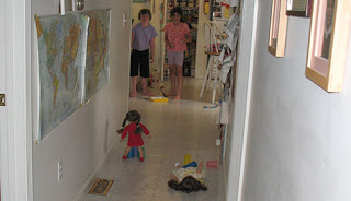 This time she involved some American Girl ‘Molly’ dolls along with the plastic cups and she and her friend A. had a grand ‘ol time with the game yesterday while the thunder and lightening storms were going on.