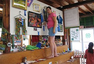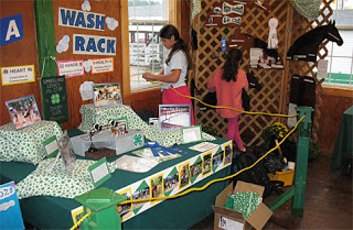 G. helped string the rope to protect the club exhibits. That darn dairy club always takes home the big 1st place rosette. Of course those 4-Hers do *awesome* projects and displays every year. The horse club display (in background) got a big thumbs up from the girls because they really liked braiding the yarn manes on the wooden horse heads. According to the girls, it was really a “fun and cool display.”