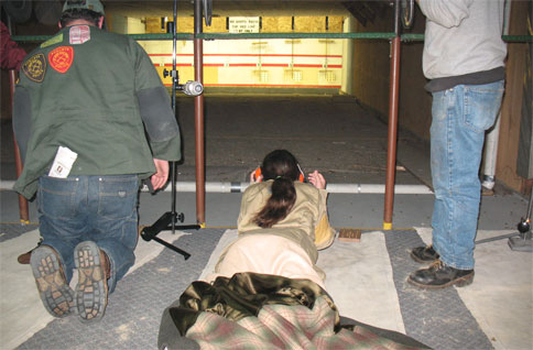 The skirt was a problem since beginners learn to shoot in the prone position first. But Fino’s coat thrown over the bottom half of G.’s legs made her feel better about that part of things.