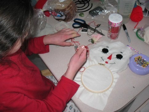 L. took advantage of her time today by starting a new sewing project – a Raggedy Ann doll. She received the pattern and all the material supplies from grandma yesterday for Christmas and she couldn’t wait to get started.