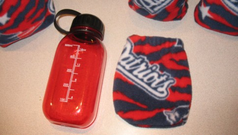 I used fleece left over from a previous project and cut to fit each of our water bottles (all different shapes and sizes) and sewed the side and bottom seams. I added a small pocket for an elastic closure at the top.