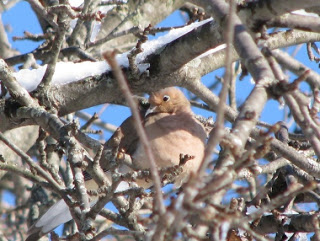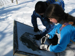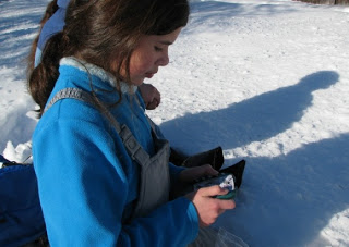After our walk through the woods and fields, we didn’t have much luck spotting any birds (it’s hard to be stealth on a pair of snowshoes) so we headed back to the bird feeders behind the Visitor’s Center and parked ourselves in the snow. We saw plenty of birds there and L. had her Bird Identiflyer (I explain the Identiflyer here) and Peterson’s Guide to help her identify the various birds. G. didn’t care so much about identifying the birds as she did about photographing them (I know I’m her mom but I think her developing photography skills are coming right along). About an hour later, with soaking wet snow pants and frozen butts, we called it a day.