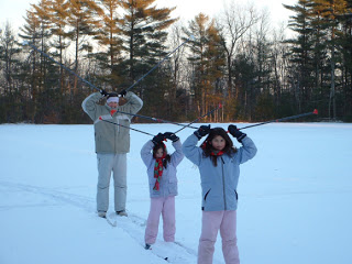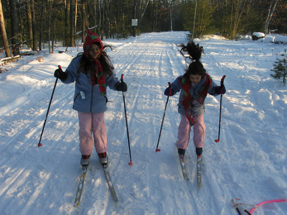 Sometimes when my family goes out on the trail, we take goofy pictures with my digital camera (in-the-air photos are a favorite, which require the skier – the girls or mom – to jump in the air with our skis from a standing still position). Jumping is a great activity to work on balance control, which comes in handy on ungroomed trails and hills.